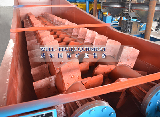 螺旋洗礦機用減速機帶動兩個螺旋攪拌軸以不同方向旋轉,進入槽體的礦物經葉片強力攪拌和清水沖洗,污水從槽尾溢流面排出,洗凈的礦物順著葉片傾角向上排出。